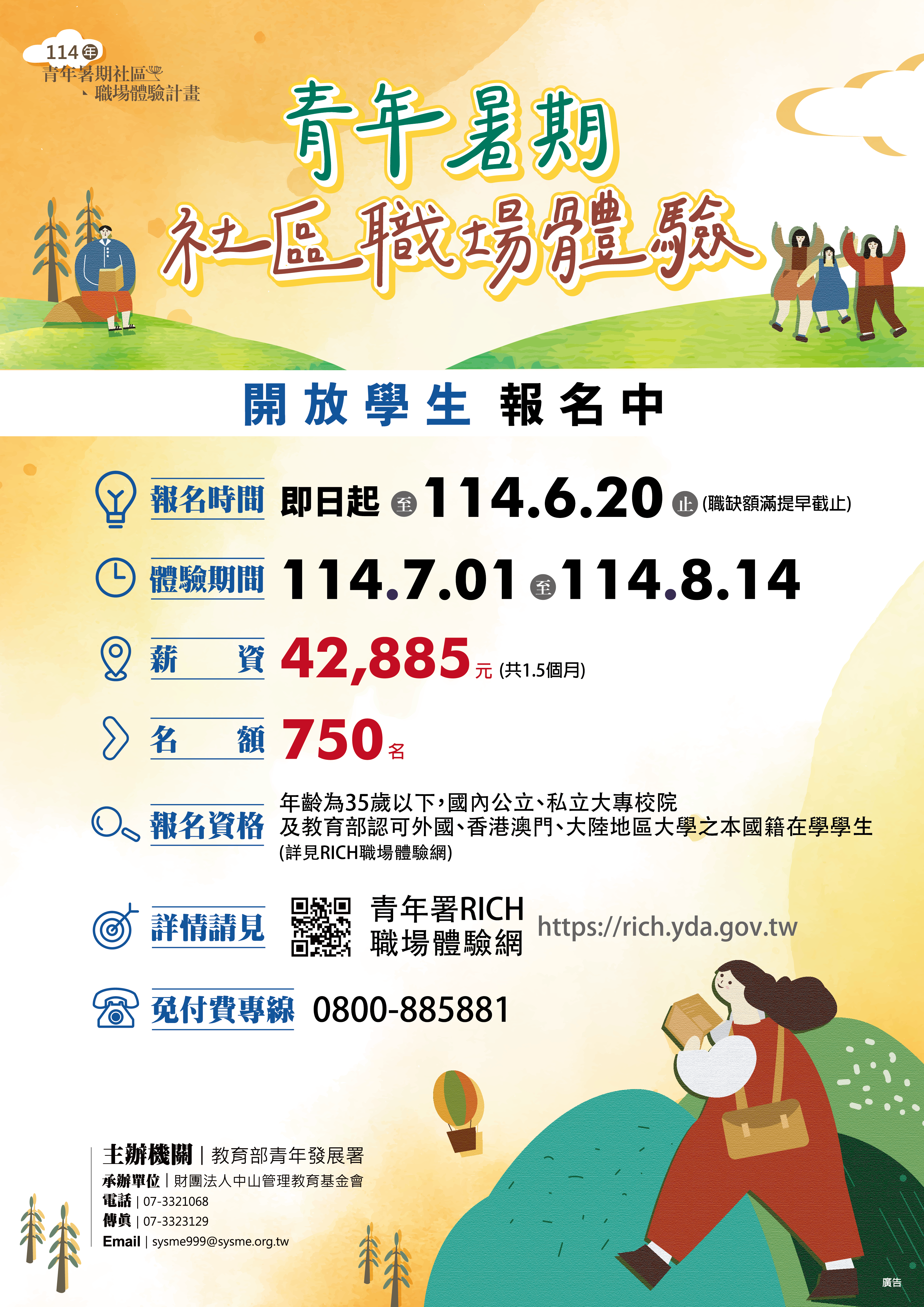 【轉知】財團法人中山管理教育基金會承辦教育部青年發展署「114年青年暑期社區職場體驗計畫」