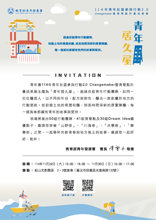 【轉知】教育部青年發展署辦理「114年青年社區參與行動2.0 Changemaker暨青聚點計畫成果展『青年居久屋』」」