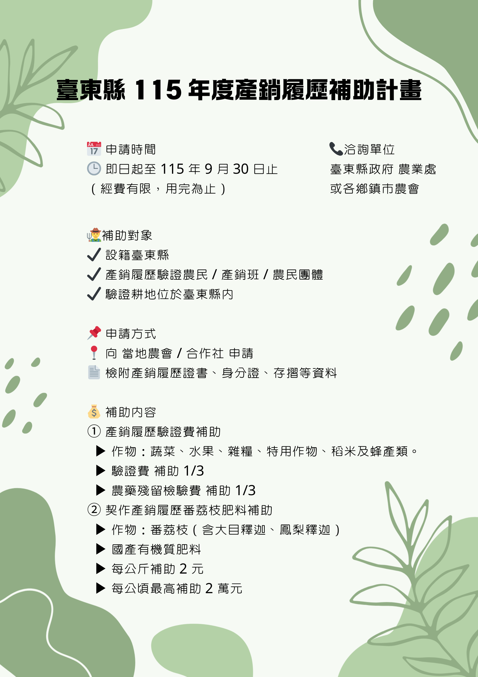 臺東縣 115 年度強化產銷履歷溯源農產品安全管理暨契作產銷履歷番荔枝肥料補助計畫